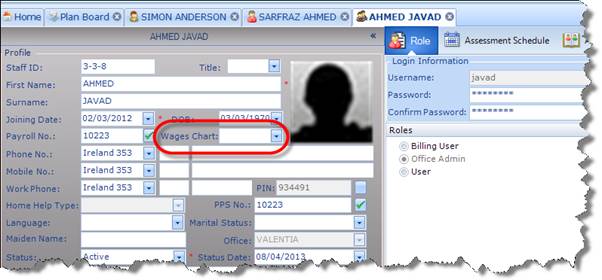 You can also link a Staff Profile with a Wage Chart; the linked chart can then be used to calculate payroll for that Member of Staff based on the hours they work in terms of Assessment Visits, but not in terms of hours worked in the office.