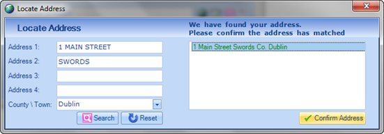 The Locate Address box will open. Click the Search button and the system will search for the Address you have entered. Results will be returned in the right hand field. Highlight the correct result and click the Confirm Address button. Now the Address is recorded on the application and the GPS coordinates are saved on the Staff Member’s Profile: