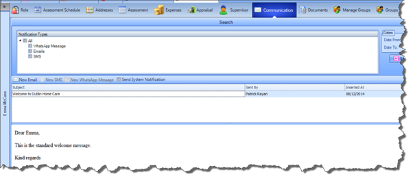 The Communications screen allows you to send emails directly from the application to Staff Members. It can be accessed via the ribbon bar on the Staff Member’s Profile, as illustrated below: