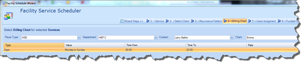 The final drop down option is the Billing Chart. This will outline the Billing Rates against which the Facility Schedule will be calculated. Please refer to Billing Charts for a full explanation of the Billing Chart functionality.