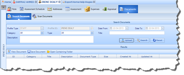 The Search Documents tab will automatically open when you enter the Documents screen. This section allows you to search on any document that has been linked with the Carer’s Profile, using any of the following filters: Date, Category, Type, Title, Description. Returned results will be displayed in the results pane, as illustrated below:
